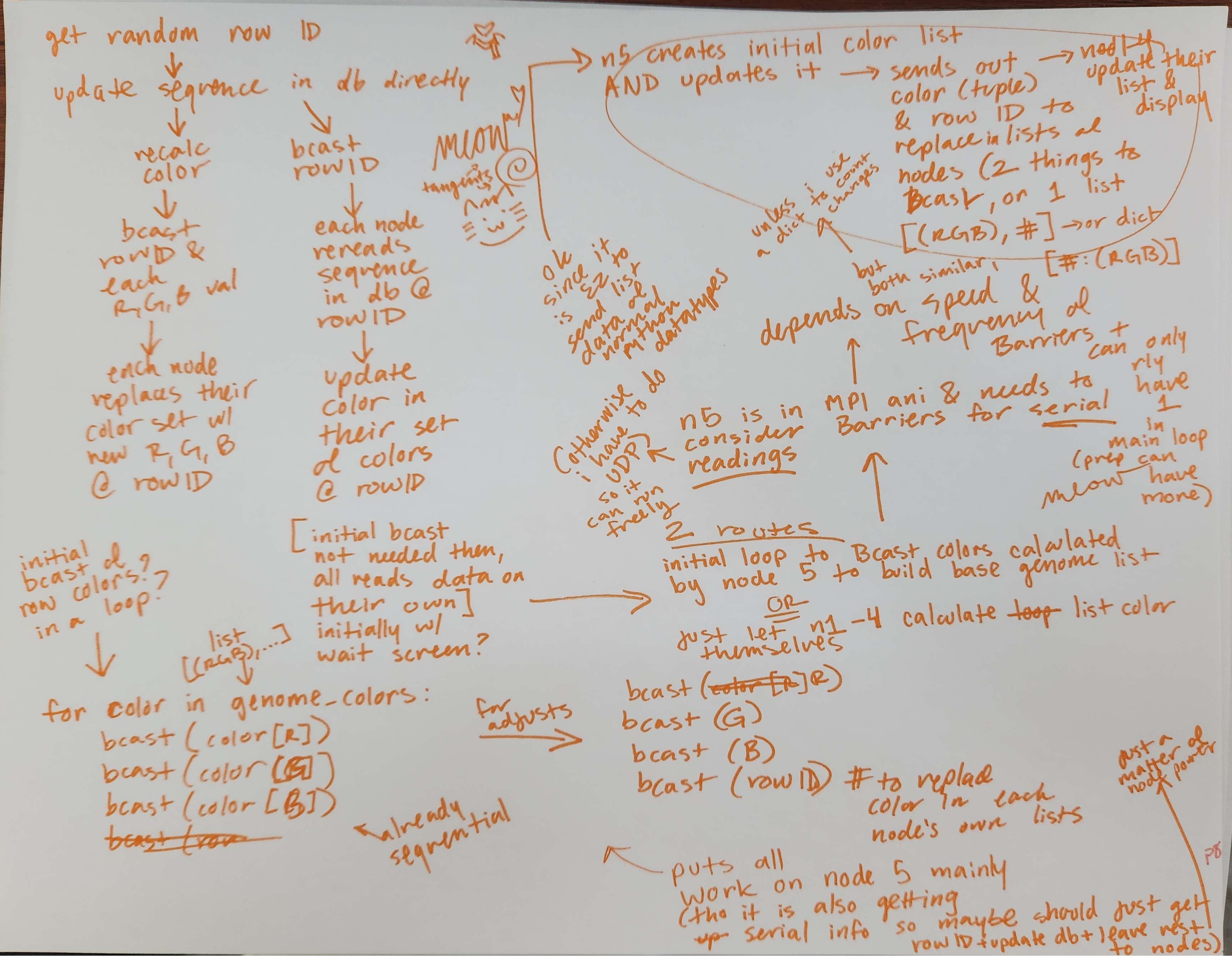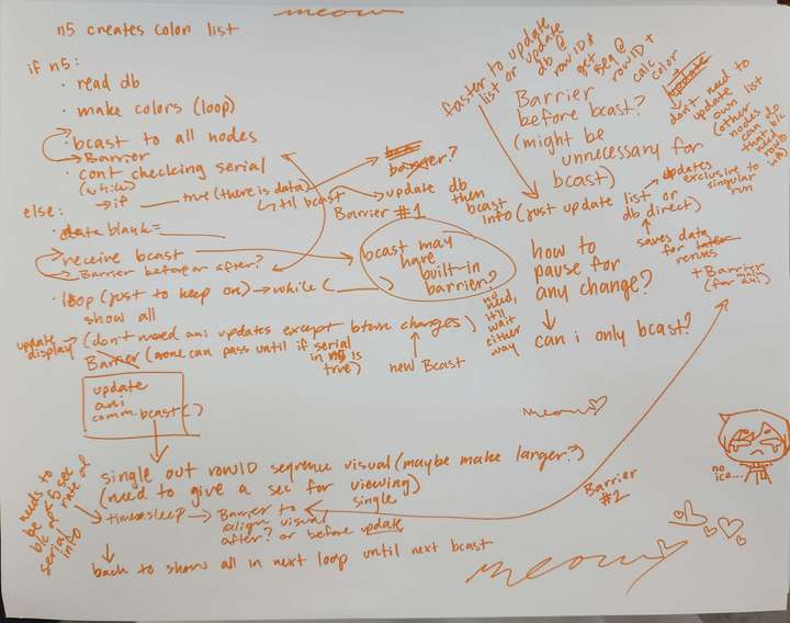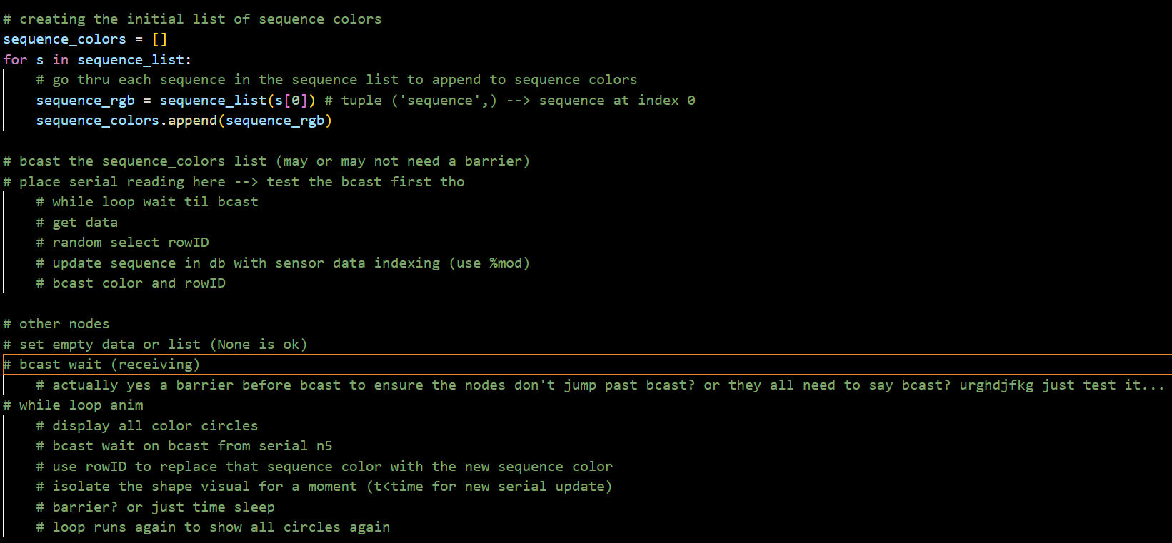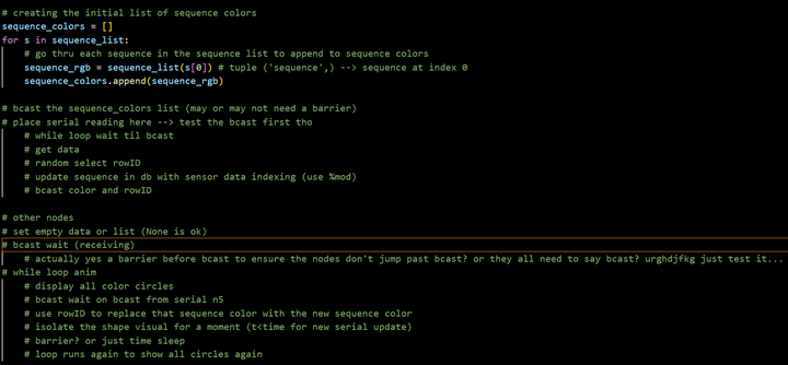 comm.bcast(sequence_colors, root=0) # send out list again (could alternatively send out the sequence alone + rowid but idk if thats any faster)