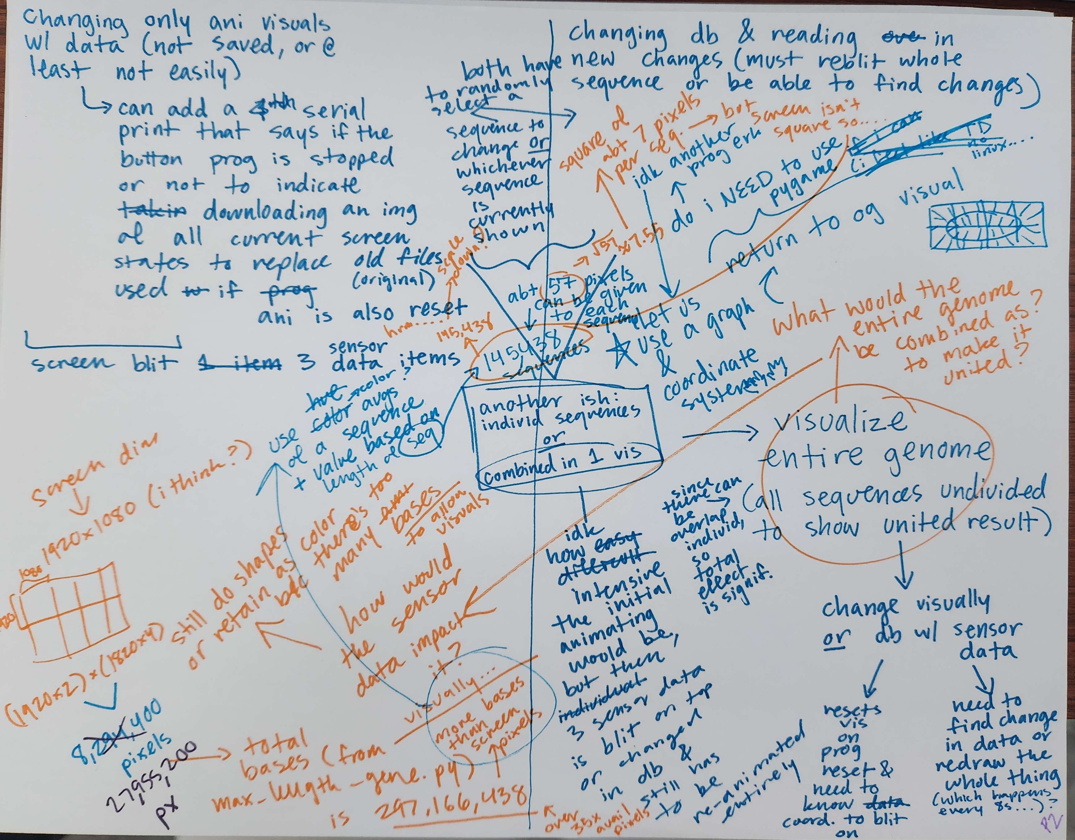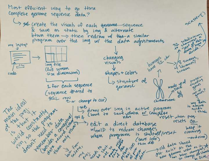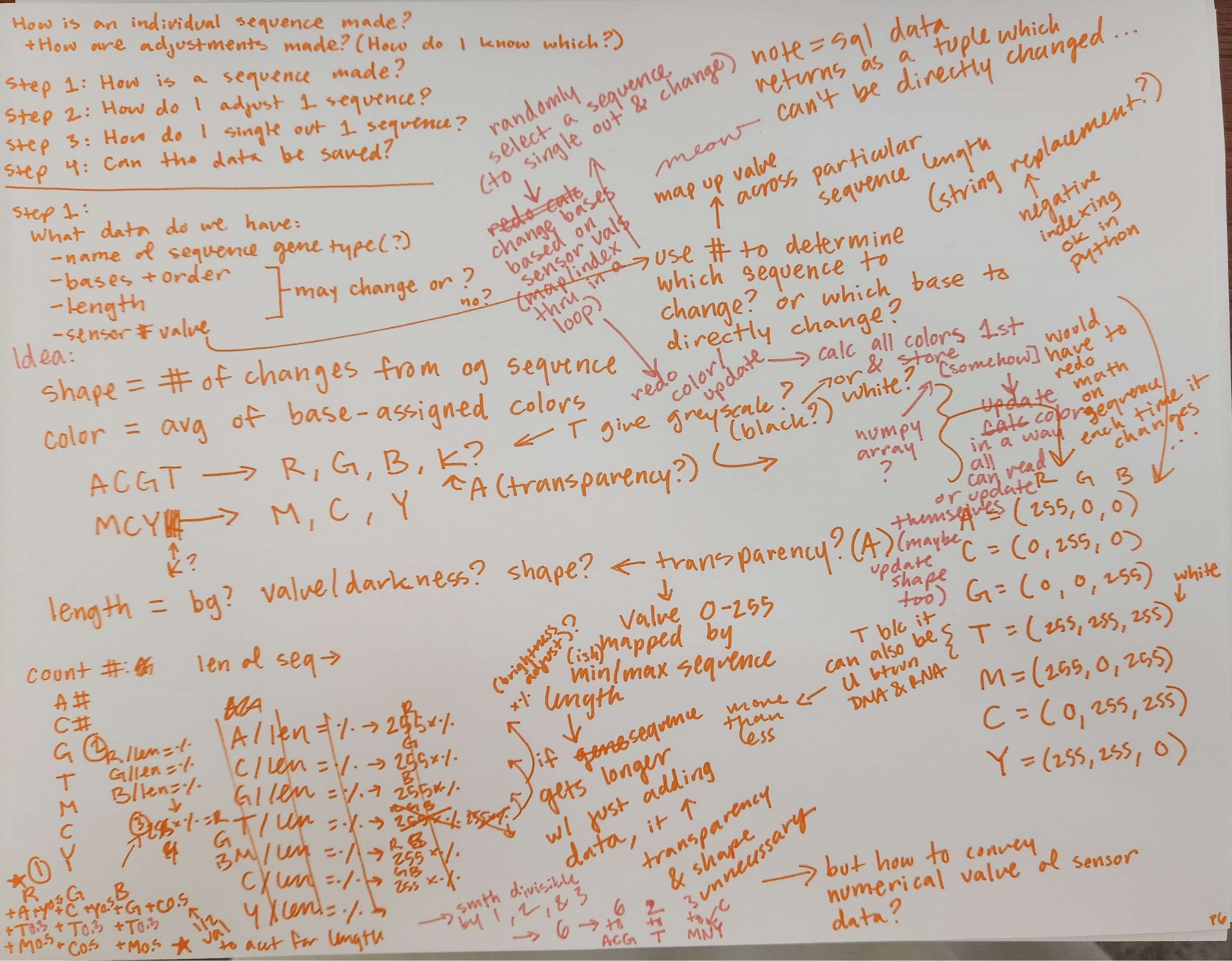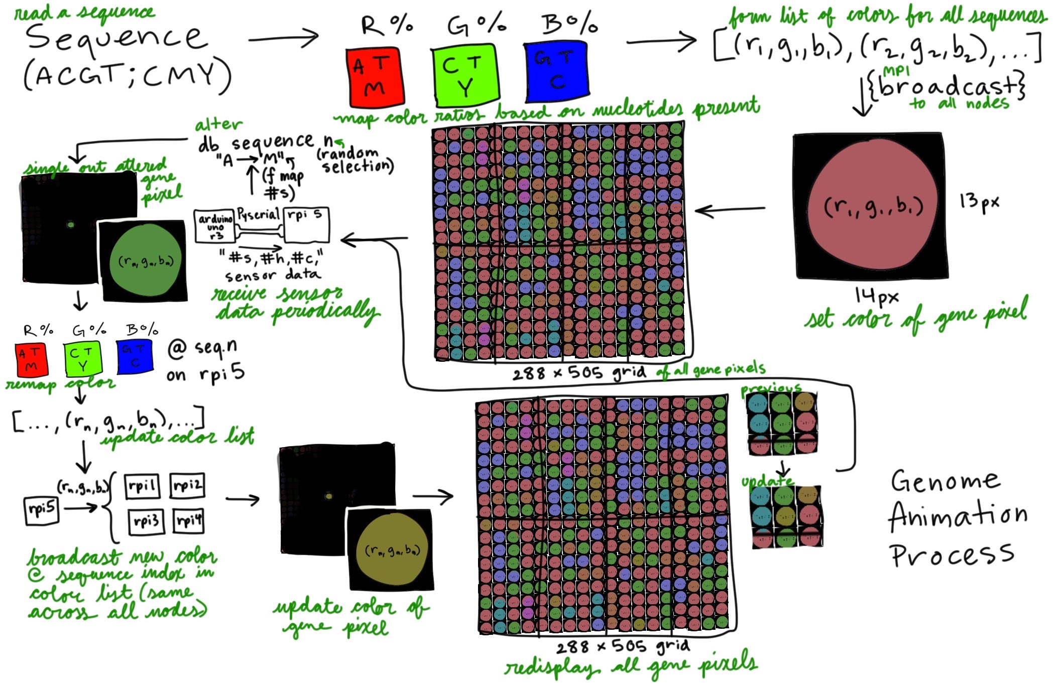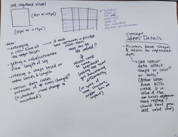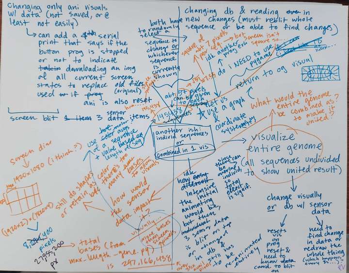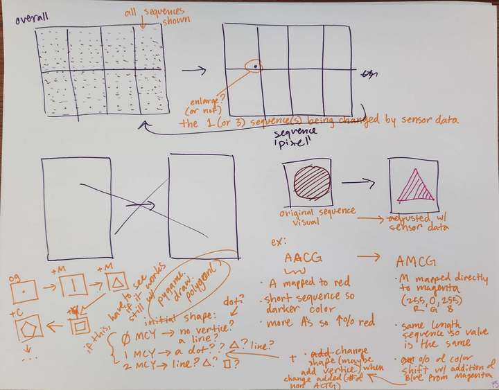 - Mapped sensor data ranges into colors and bases that directly replace bases in the given gene sequence of the genome data.